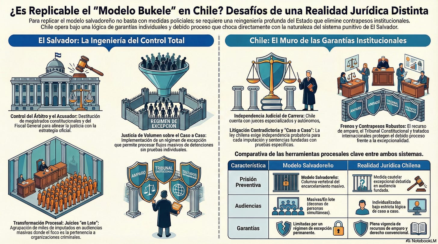 Si en El Salvador, el “modelo” se sostiene en el control del árbitro constitucional, la reingeniería de la carrera judicial y de la Fiscalía y herramientas procesales para tramitar simultáneamente grandes volúmenes, en Chile el “sistema” opera con una lógica distinta: más frenos institucionales, vigencia de garantías, más litigación contradictoria y menos espacio para un “carril excepcional” permanente.